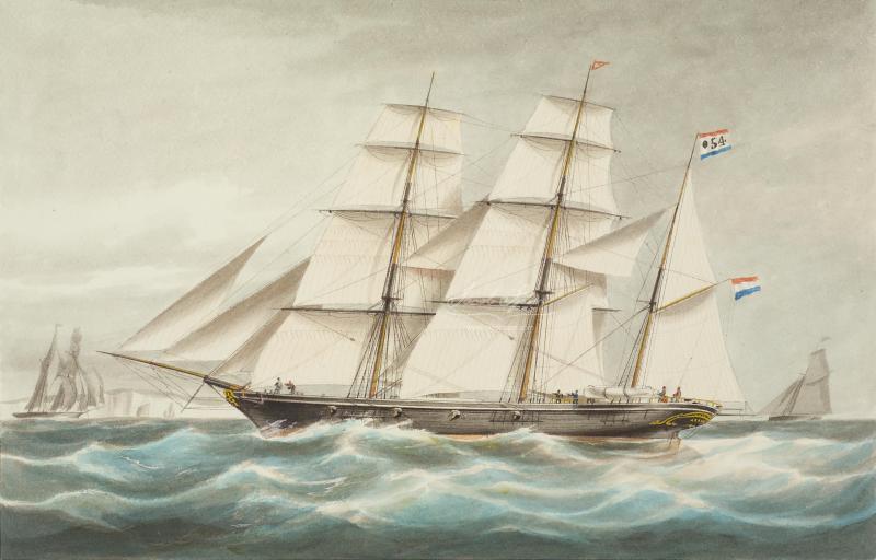 Afbeelding uit 1824 van het fregat “De drie Gebroeders” door Jacob Spin, het eerste schip waarop hij als matroos aanmonsterde.